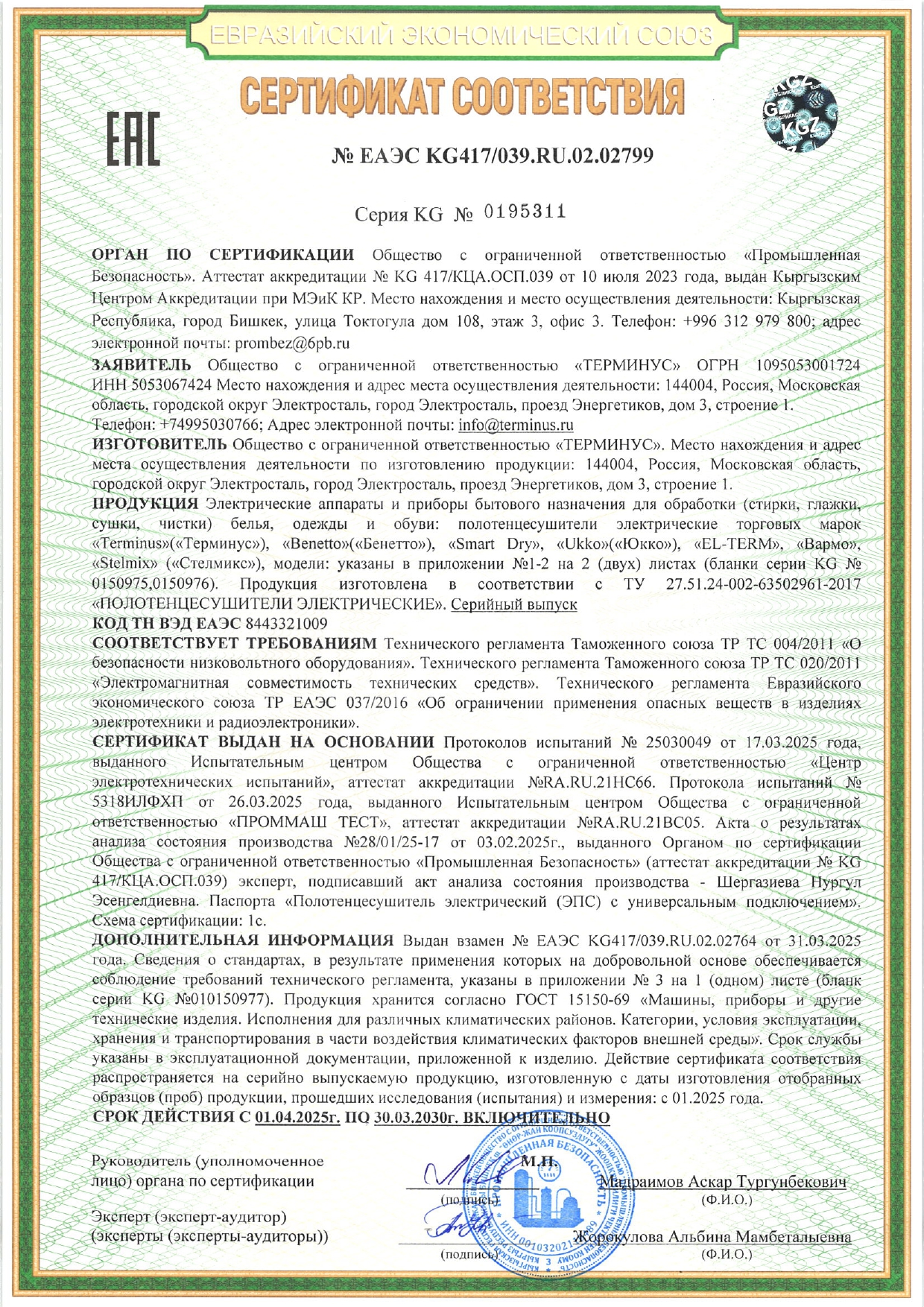 Сертификат соответствия: № ЕАЭС КС417/039.1Ш.02.02799